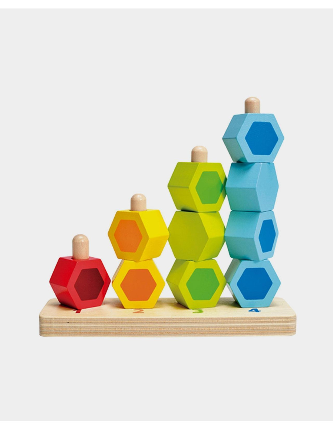 Encaja, Apila y Cuenta es un juego realizado en madera natural imprescindible para los primeros conocimientos del niño. Con el podrá comenzar a ensartar formas, apilar, conocer los colores y los números. Sus varillas son abatibles por seguridad.