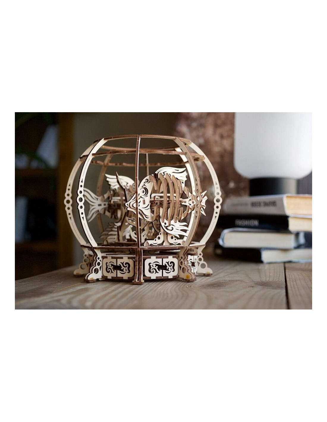 Con su original tema y diseño, esta maqueta de bricolaje acuario-kit no solamente es una atractiva ampliación del catálogo Ugears, sino que también ofrece una acción mecánica única. Los peces de acuario y las algas giran simultáneamente y en paralelo, a diferentes velocidades y en distintas direcciones, simulando los ritmos suaves y ondulantes de la flora y fauna submarinas. Moviendo su cabeza y cola de un lado al otro, los peces parecen nadar de verdad. Mientras muchas otras maquetas o puzzles de madera de Ugears están accionadas mediante motores de gomas elásticas, la singularidad de la maqueta Acuario Mecánico consiste en que su accionamiento se basa en un muelle, para prolongar la acción y aumentar la vida útil. En Ugears estamos orgullosos de nuestras innovaciones, y de escuchar a nuestros leales clientes. Muchos de ellos ya nos habían preguntado por modelos con mecanismos accionados por resorte. Por ello, nos alegramos poder presentarle este acuario con accionamiento por muelle — ¡el primero de nuestro creciente catálogo de maquetas Ugears!