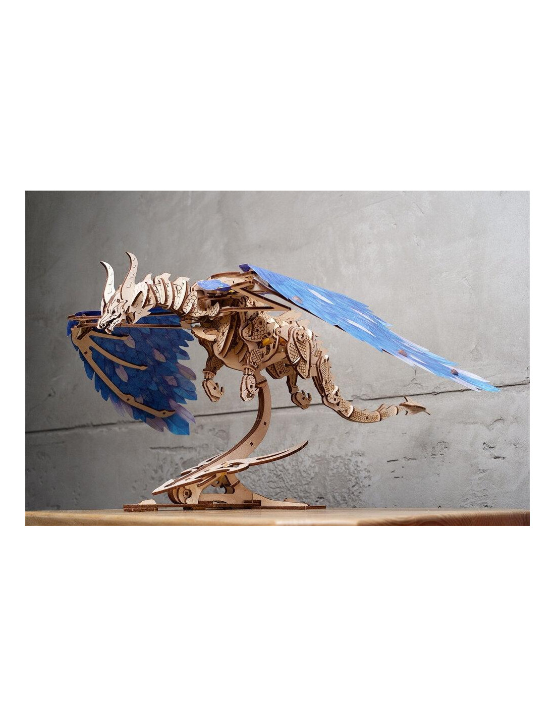 El diseño abierto de este puzzle de madera le permitirá ver los latidos del corazón de su maravillosa nueva mascota , un motor de gomas elásticas. En la parte de su pecho el modelo dispone de una llave para darle cuerda. Para ello, agarre el dragón por su cuerpo y gire la llave en el sentido de las agujas del reloj. Suelte el motor tirando de la palanca de arranque. Y entonces comienza la magia: los brazos, las piernas e incluso el cuerpo entero del Dragón empiezan a moverse. Y por supuesto también las dos fuertes y bellas alas. Esta es la característica especial de la maqueta para montar Dragón de Ugears, los huesos de las alas son de madera, pero el resto se compone de papel con un precioso diseño en forma de plumas. El material más suave y flexible proporciona un gran realismo al vuelo y dará alas a sus propias ideas.