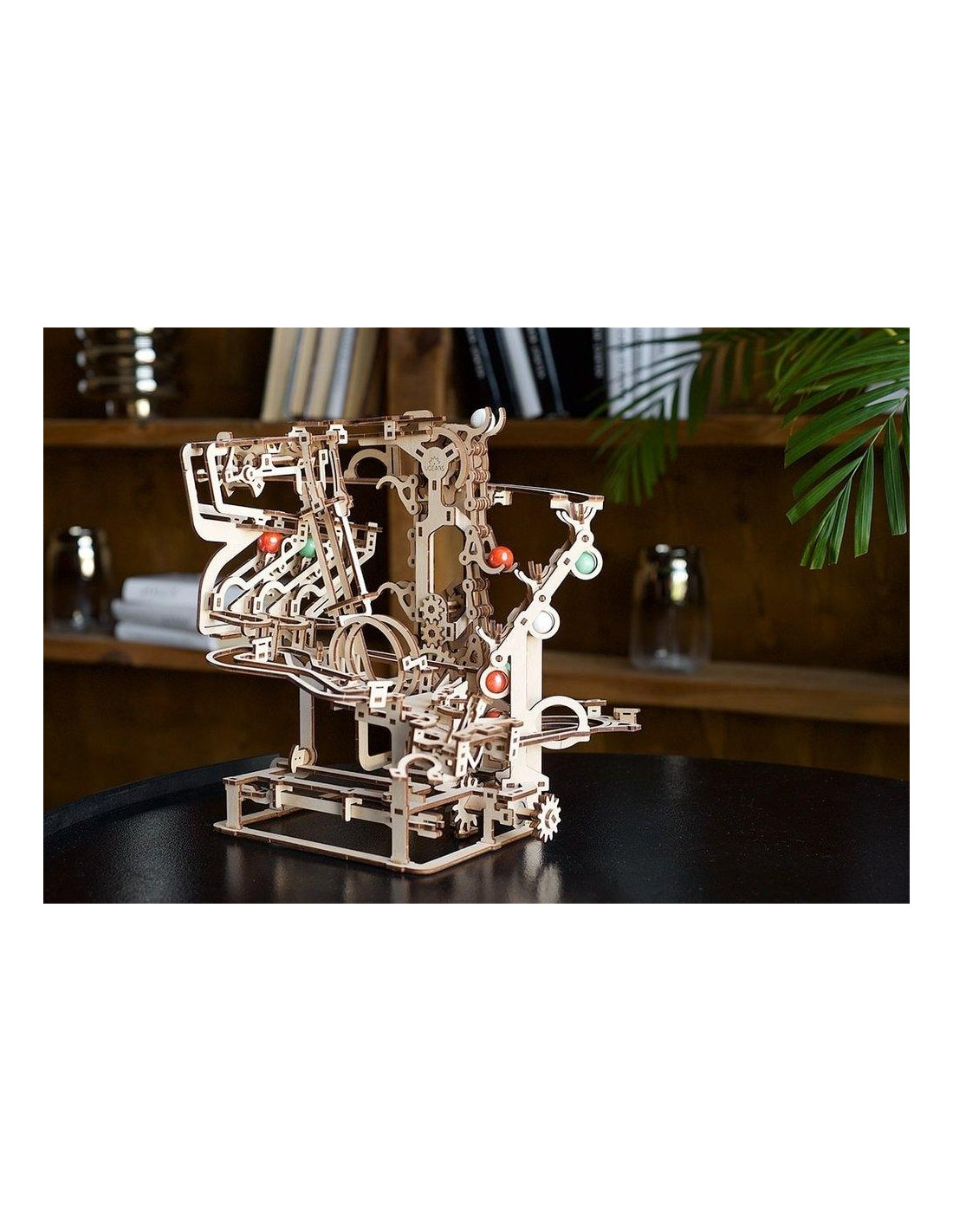 Presentamos la Cadena de Carrera de Canicas de Ugears — una apasionante combinación de arte e ingeniería. La Cadena de Carrera de Canicas es una bella escultura cinética y un sofisticado juguete con el que aprenderá divirtiéndose. Este circuito de carrera de canicas de madera incluye un polipasto de cadena activado mediante manivela, así como una serie de pistas, cada una de ellas con su específico obstáculo o elemento divertido. Gire la manivela en el sentido de las agujas del reloj para poner en marcha la máquina y mire como el polipasto de cadena de madera recoge y sube las canicas a la parte superior del modelo, donde un interruptor de 3 vías las envía hacia las diferentes pistas. Una de las canicas se precipita por una rampa en cuyo extremo inferior se encuentra un Loop-the-loop, la siguiente va rodando bajando escalón por escalón la cascada, y en el acumulador se juntan otras que después se liberan para bajar por una de las tres pistas cortas. Todas las canicas pasan por la plataforma común (o colector) antes de retornar hacia el polipasto de cadena, el cual vuelve a subirlas para que emprendan su próximo viaje.
