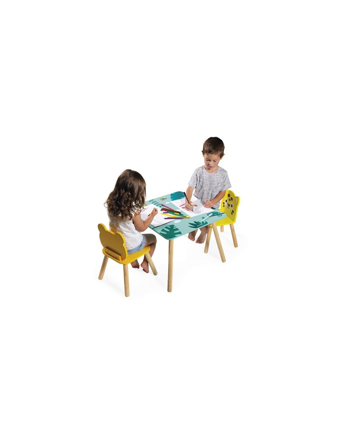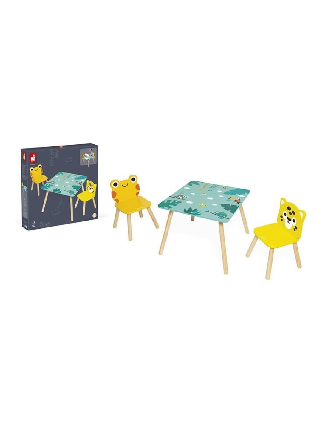 ¡Un oasis en plena selva tropical! Este mobiliario, compuesto por una mesa de alegres colores y dos sillas en forma de rana y jaguar, encajará perfectamente en el salón o en la habitación del niño. Este conjunto acompañará al niño en momentos tranquilos mientras lee o para pasarse horas jugandoy dibujando. Pintura al agua. Estos muebles son adecuados para niños a partir de 3 años.