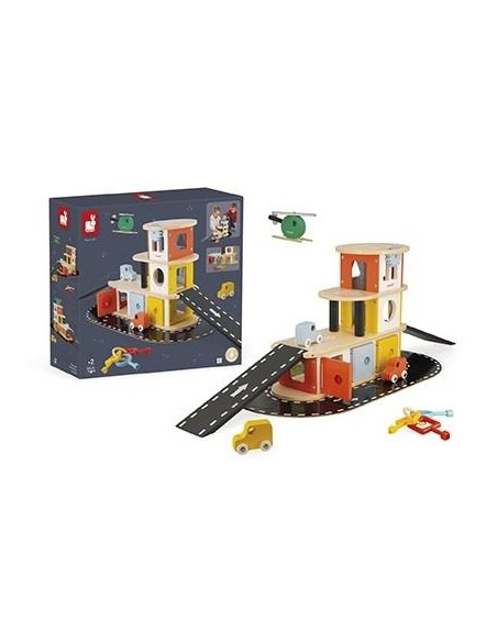 ¡Brum, brum! ¡Es hora punta! He aquí la danza de coches que entran y salen para ir al aparcamiento tomando las rampas y el ascensor, o para pasar por el lavado automático... Cae la noche, es hora de guardar el automóvil en su garaje. Un auténtico garaje funcional que se abre mediante llaves adaptadas y cerraduras geométricas que hacen que cada puerta sea única. Horas de juego garantizadas con este garaje de madera, sus 3 coches y su helicóptero. Juguete de madera FSCTM. Ideal para desarrollar la motricidad fina y la imaginación. Juguete de iniciación para niños a partir de 2 .