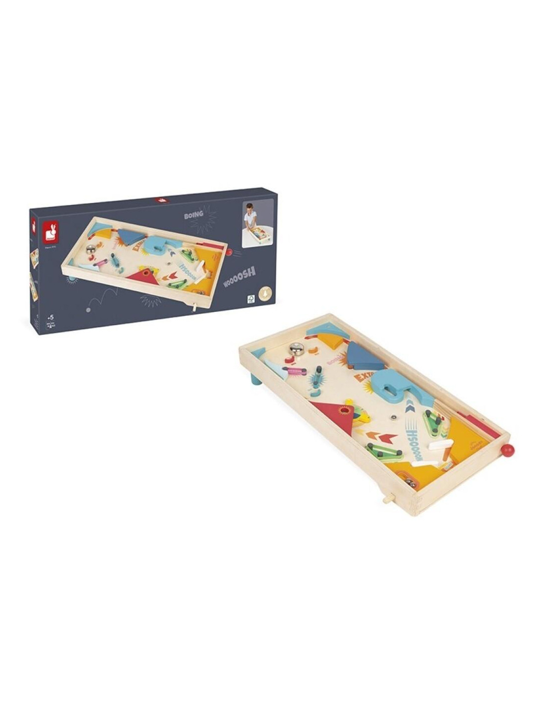 Juguete de madera para niños de 5 años o màs. ¡Magnífico flipper de madera colorido para desarrollar la concentración y la rapidez mental! Lanza la bola de metal para que suene la campanilla y acumula puntos pasando por la ruleta y rebotando en las cintas elásticas. Incluye 3 bolas de metal.