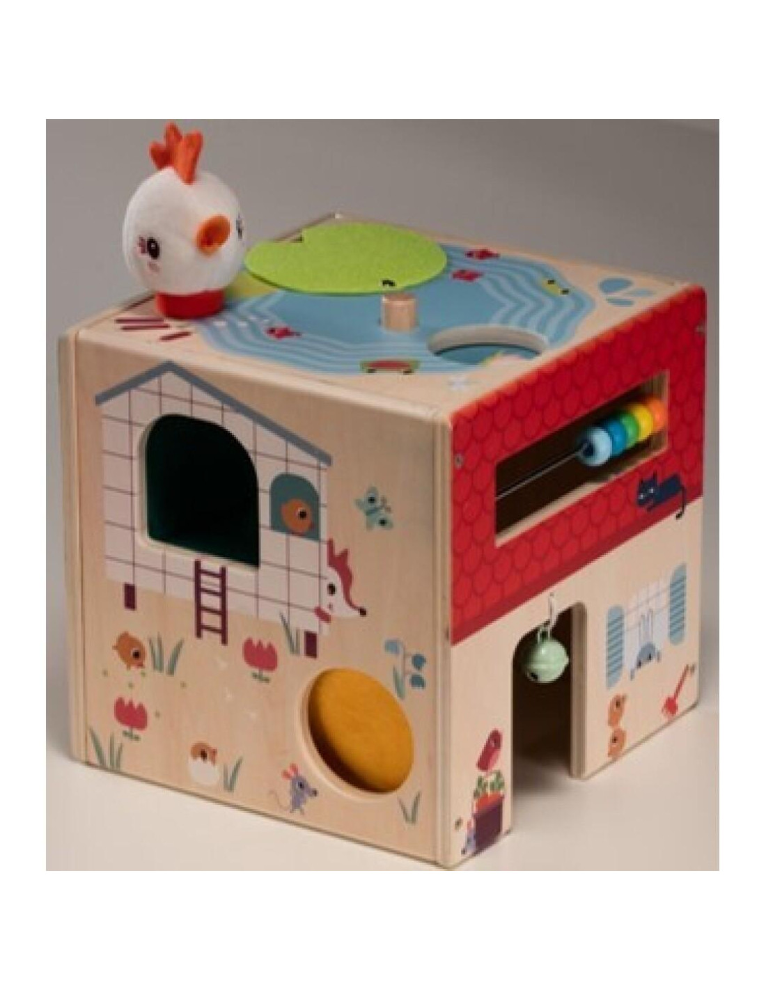 Este cubo de actividades de madera Granja ofrece un montón de actividades en cada cara. El Pollito Paulette, se zambulle en el estanque, descansa en su nidito mullido o se va a explorar las caras del cubo con hermosas ilustraciones. Todo un desafío y mucha estimulación para los sentidos, los deditos, el cerebro y la imaginación.