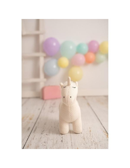 UNICORNIO MINI DE CROCHET ( hipoalergénico ) Nuestro peluche unicornio minii de crochet está confeccionado con los mejores materiales. Lana de algodón 100% natural, hipoalergénica y muy suave al tacto. Bordado a mano, con mimo en cada detalle, como su cuerno o su crin en color rosa que le aportan un toque especial. Un excelente juguete para los niños o un hermoso elemento de decoración para habitaciones infantiles o escaparates de establecimientos comerciales.