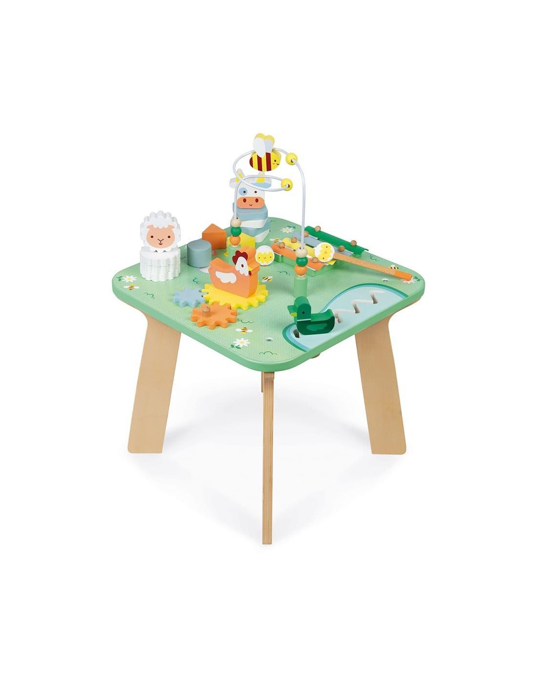¡Rumbo al campo y sus bonitos prados de flores silvestres con esta mesa multiactividades donde los bebés encontrarán a todos los animales de la granja! El niño descubrirá un montón de juegos nuevos con esta mesa supercompleta que incluye siete actividades: dos animales para apilar de dos formas distintas que desarrollan la motricidad fina, un laberinto con un pato que se pasea por la charca para reforzar la coordinación mano-ojo, un sistema de engranajes que se giran para que entienda la relación causa-efecto, tres cubos de encajar para aprender las formas, un ábaco para trabajar la concentración y un xilófono de metal con dos baquetas para despertar su sensibilidad musical. Con esta mesa de estímulo de madera recomendada a partir de 12 meses, los niños no pararán de descubrir cosas en un entorno que les encanta. Altura de la mesa: 32 cm. Pintura al agua.