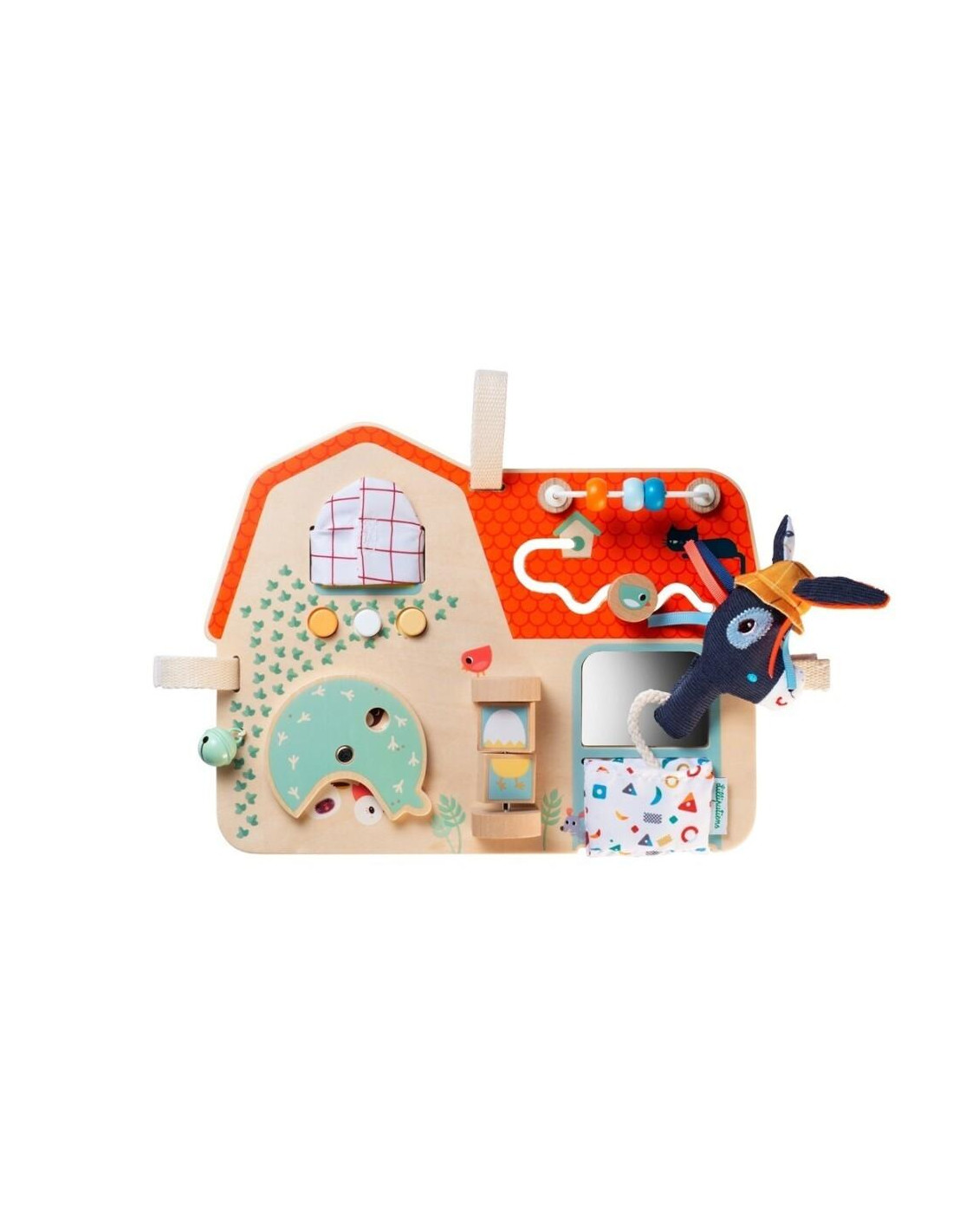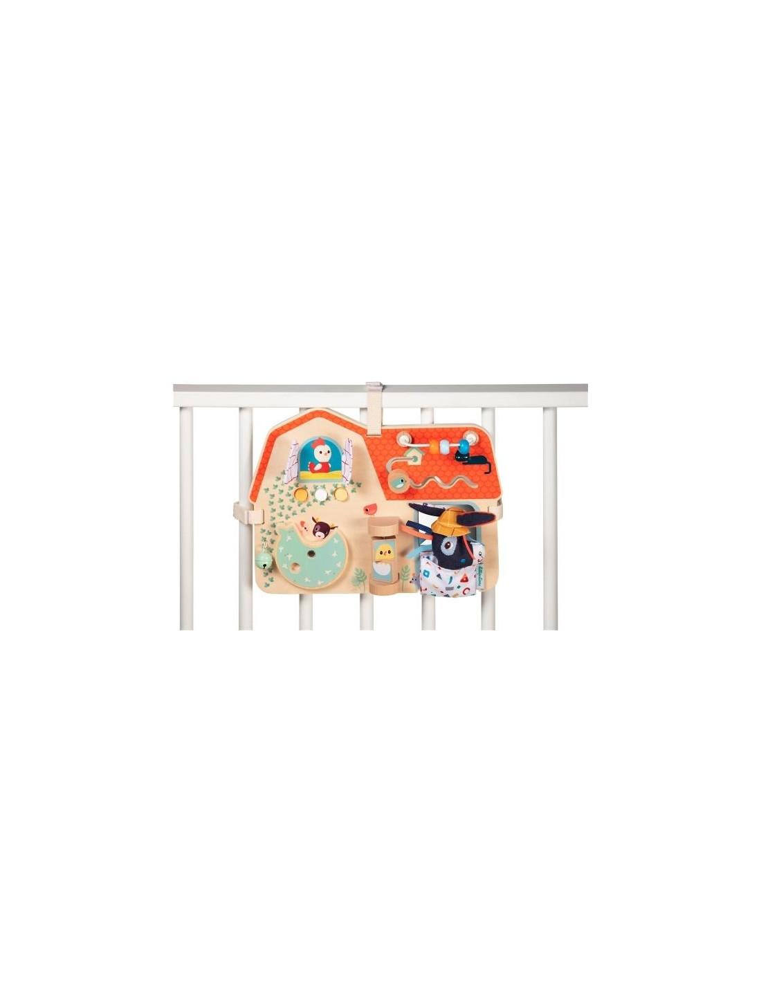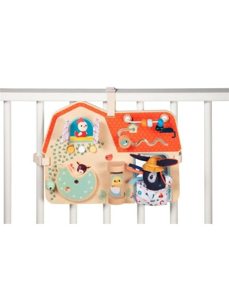Este panel de madera con forma de granja ofrece un montón de actividades y materiales que estimulan a los más pequeños a descubrir. Sus maravillosas ilustraciones cuentan la historia de los animales de la granja. Se puede colocar en el parque fácilmente con los broches de velcro.