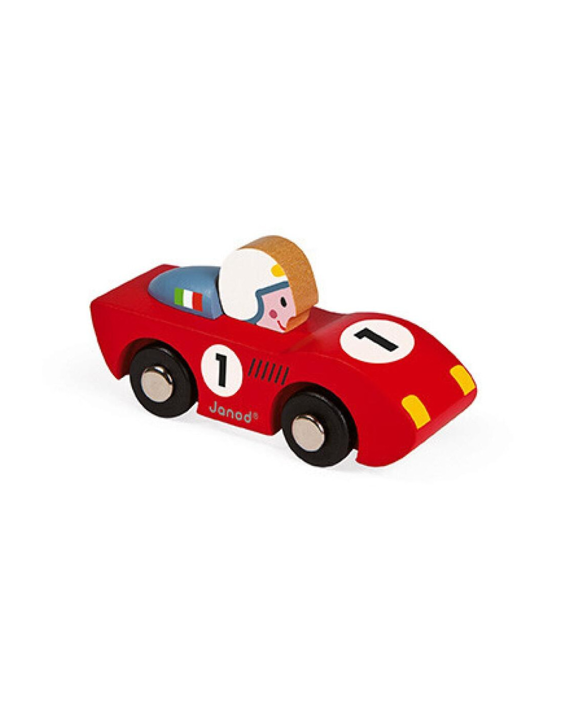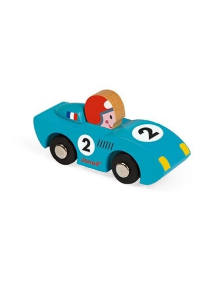 Coche de carreras de madera, disponible en colores azul y rojo (modelo aleatorio). La cabeza del piloto cuenta con un sistema de doble fijación (tornillo y adhesivo) y las ruedas están remachadas en su sitio, garantizando así la máxima seguridad. Compatible con toda la gama de juguetes de la serie Cuentos. Esta gama incluye numerosos modelos a coleccionar: vehículos de Prueba de velocidad, Fórmula 1, Clásicos de carreras, Deportivos y Bólidos. Materiales utilizados: madera de cerezo. Diseñado en Francia.