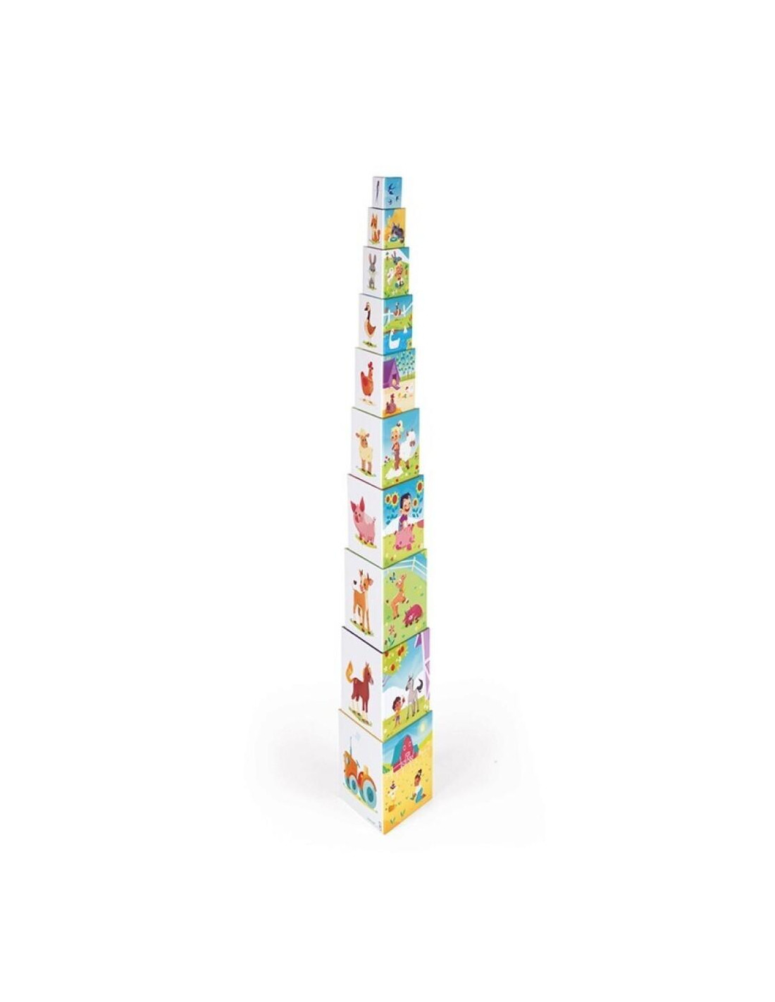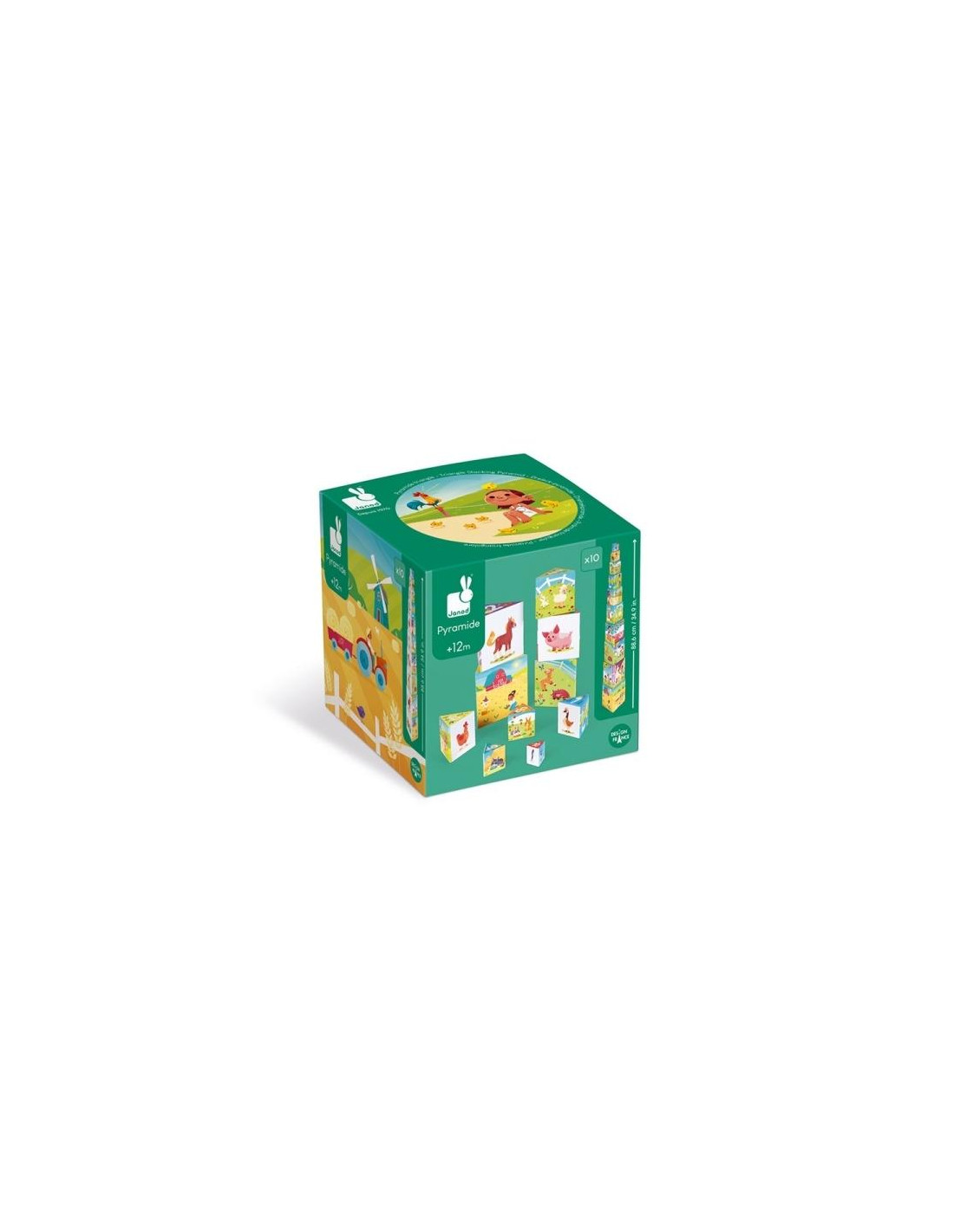 Pirámide de cartón para niños de 12 a 36 meses. 10 elementos para apilar para reconstruir una magnífica pirámide y descubrir los animales y las distintas actividades de la granja. En la parte superior de cada elemento también figura un número. Con esta pirámide, su hijo descubrirá los animales de la granja de mayor a menor mientras aprende a contar hasta 10. ¡Desarrollará su motricidad gracias a su forma triangular, y su imaginación divirtiéndose!
