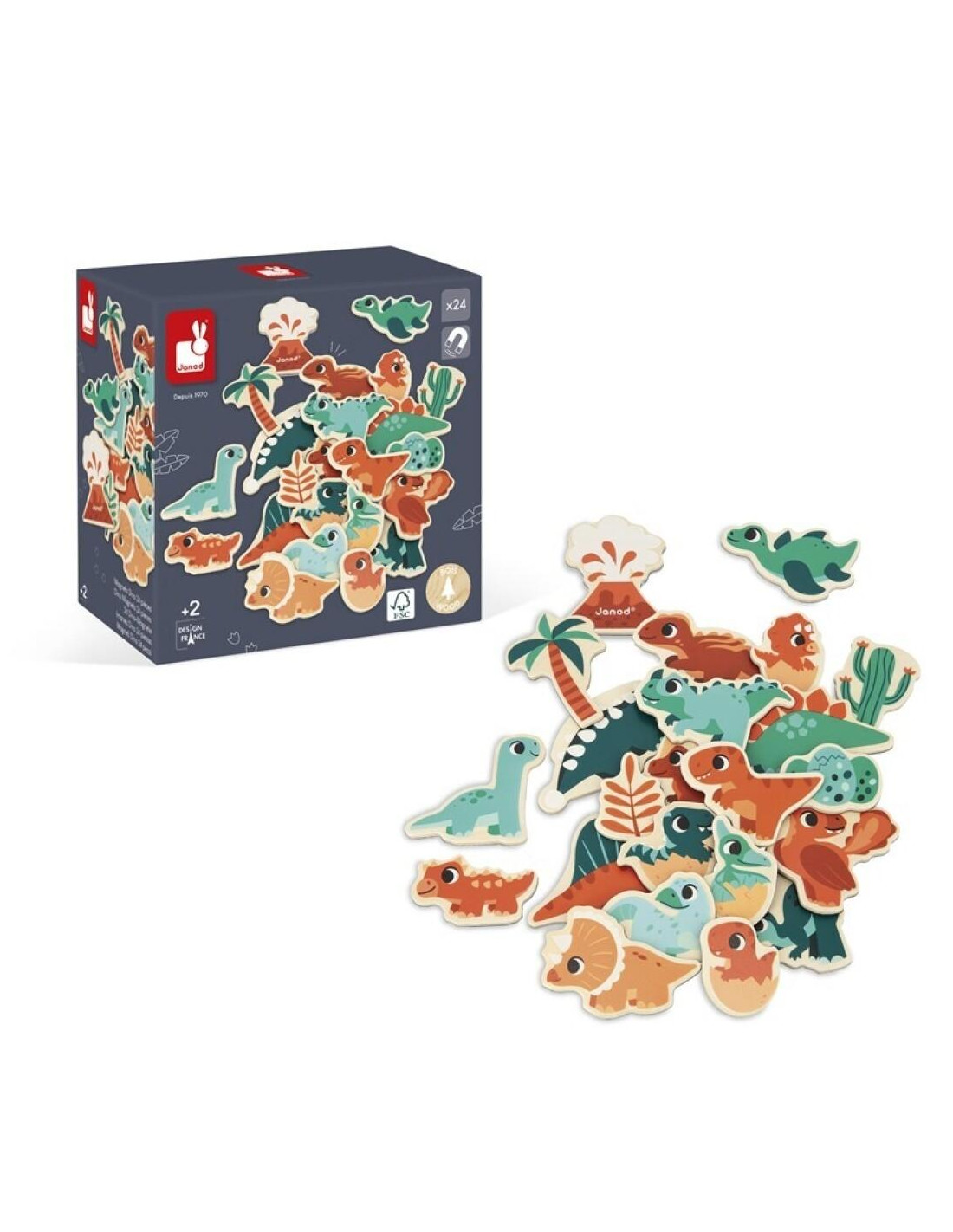 ¡Embárquese en un viaje a través del tiempo en el mundo de los dinosaurios con nuestros imanes Dino! Se pueden imaginar bonitas historias con el Spinosaurus, el Stegosaurus, el Pteranodon y todos los demás. Este kit está compuesto por 24 imanes de madera que se pueden colocar en pizarras magnéticas, o cualquier otra superficie magnética. De esta forma, su hijo podrá desarrollar su imaginación y su destreza mientras se divierte. Juguete de madera FSCTM. Para niños a partir de 2 años.