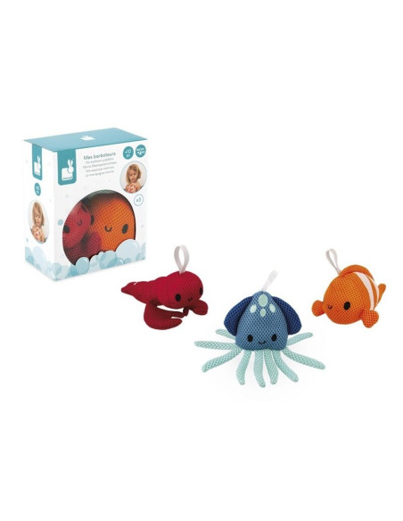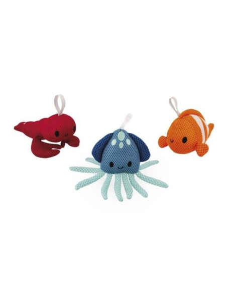 ¡Consiga que su hijo sea más autónomo con estas bonitas esponjas de baño! Este set está compuesto por 3 animales marinos: una langosta, un pez payaso y un calamar. Solo hay que mojarlas y añadir un poco de jabón para hacer espuma. Adaptadas a las manos de los más pequeños, las esponjas de baño le permitirán enseñar a su hijo a lavarse él solo mientras se divierte. Juguete para el baño para niños a partir de 10 meses.