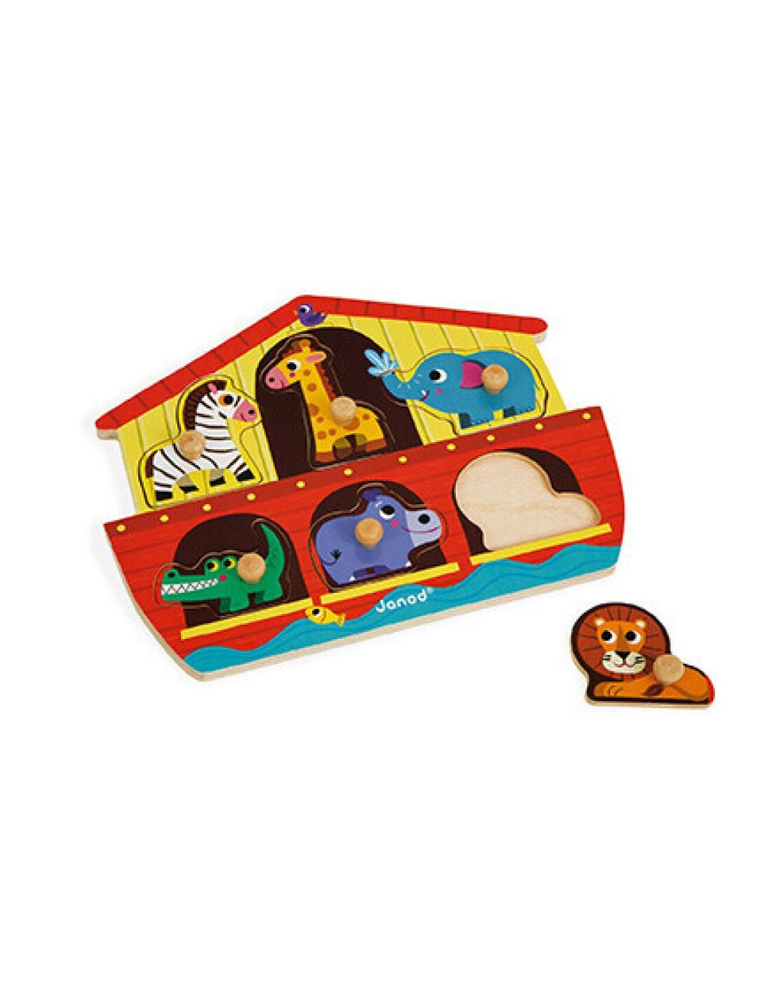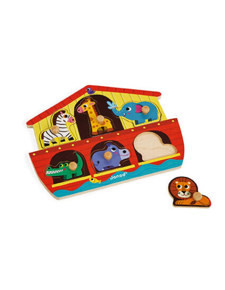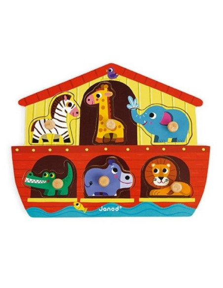Puzle de motivación fabricado en madera sobre el tópico Arca de Noé. Original tablero en forma de barco. Piezas con pomo para que resulten más fácil de manipular. Número de piezas: 6. Materiales utilizados: madera (contrachapado). Diseñado en Francia.