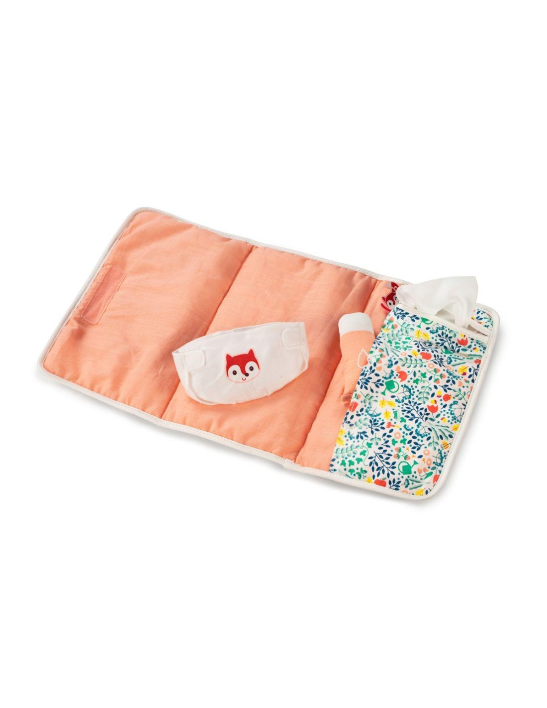 Este precioso cambiador de muñecas dará el toque extra de diversión cuando los peques desarrollen el juego simbólico (o juego de imitación). Es un cambiador muy completo y no le falta detalle, incluye todos los accesorios necesarios para poder cambiar a sus muñecas favoritas. La crema, la mantita y el pañal caben perfectamente en los compartimentos previstos para ello. Cuando termina el juego solo hay que plegarlo y todo queda recogido. Incorpora una asa para poder llevarlo cómodamente donde quieras.