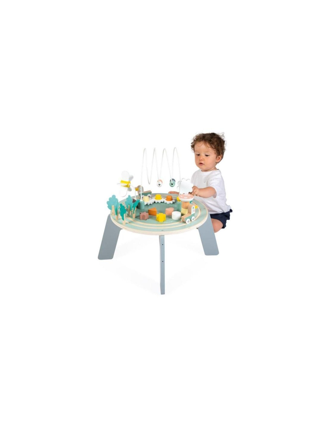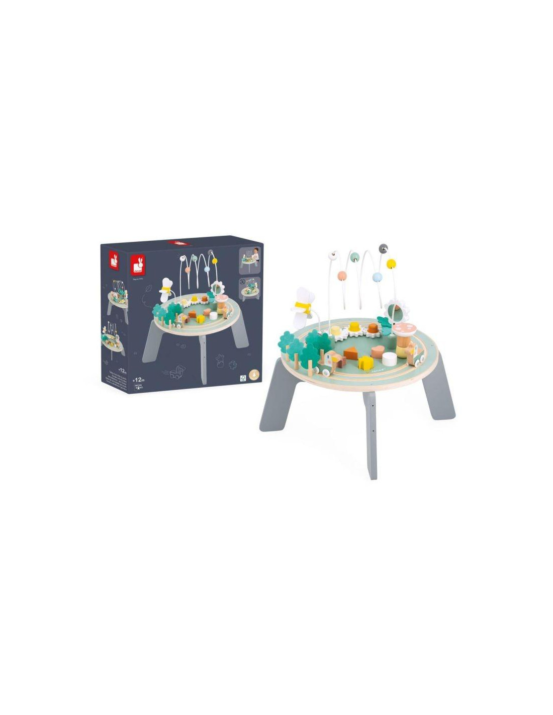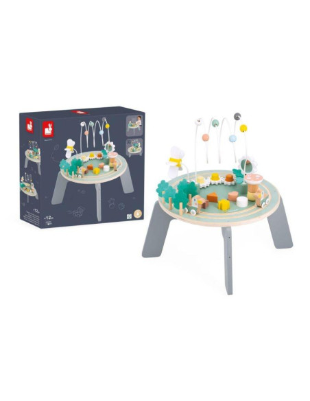 ¡Ven y explora este jardín con actividades superdivertidas! En esta mesa de actividades encontrarás: una seta gigante para apilar, 5 piezas para encajar, un bosque de hojas de fieltro, una margarita gigante para apilar con un espejo encima para mirarse, 1 gran ábaco, 3 engranajes con forma de flores, un molino que gira cuando el pato pasa por debajo y una seta que hace crac-crac. ¡En total, tiene más de 8 actividades que garantizarán horas de juego y diversión para los más pequeños! Esta mesa evoluciona con el niño, las patas se pueden poner en posición alta (altura del tablero: 22 cm) o baja (altura del tablero: 13 cm), ¡práctica! Juguete ideal para que el bebé desarrolle su motricidad fina. Juguete de estimulación de madera FSCTM. Para niños a partir de 12 meses.