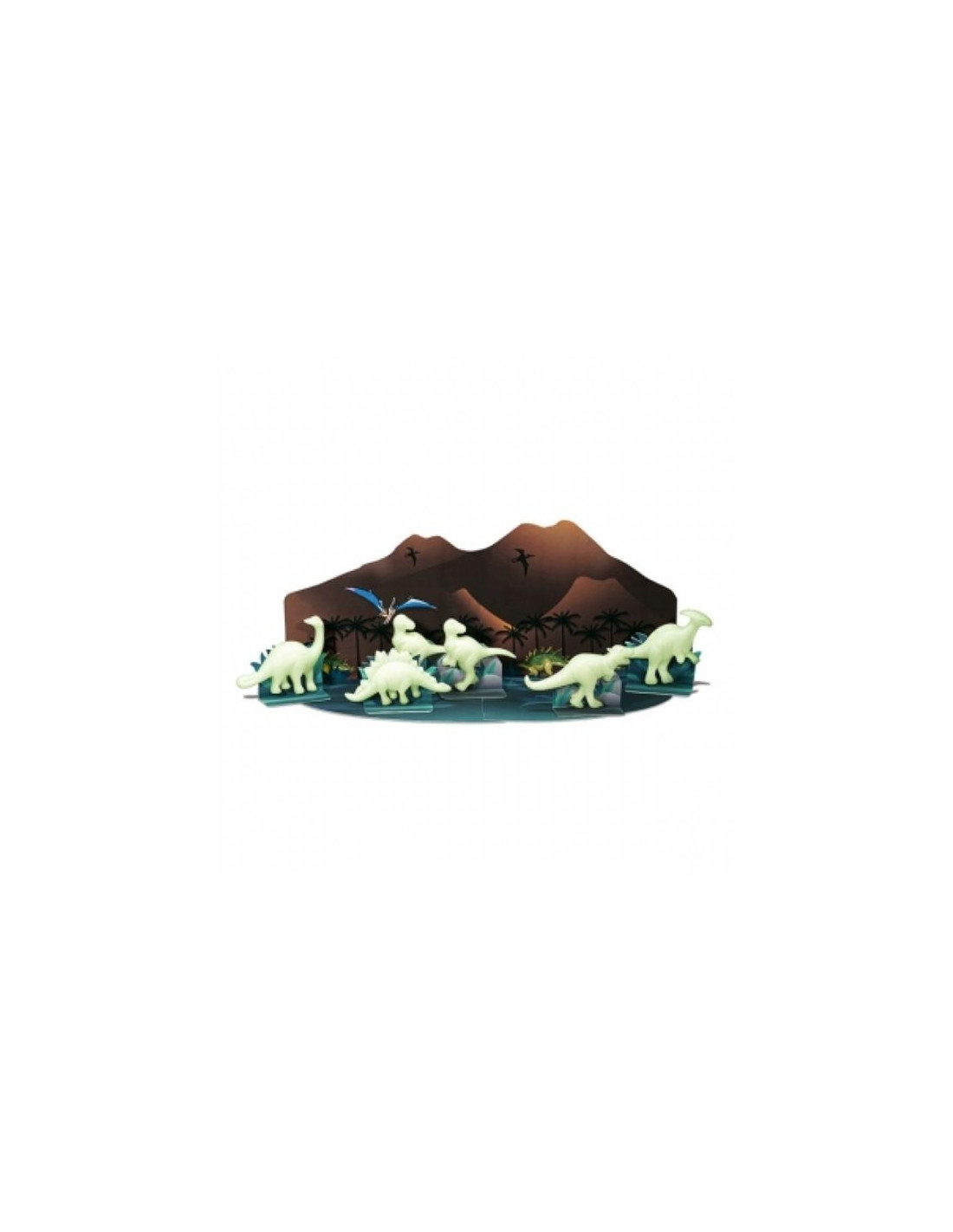 Los peques podrán jugar con sus propios dinosaurios brillantes en la escena pop-up entregada con el juego. Las figuras incluyen zona adhesiva en ambos lados y por lo tanto, también tienen la opción de pegarlos en la pared de su habitación, convirtiéndola en un verdadero escenario jurásico.