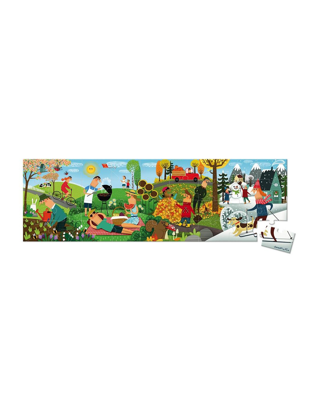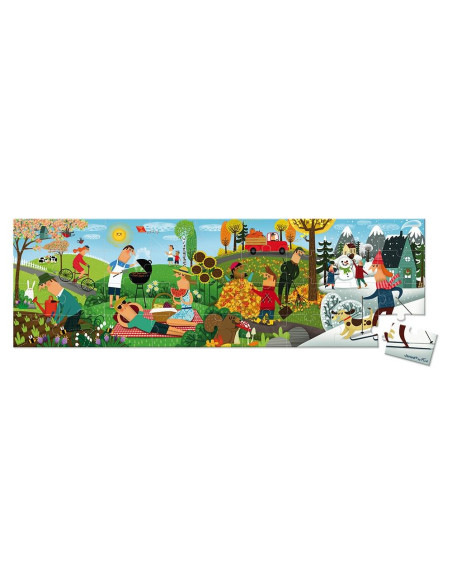 Puzle panorámico de cartón de 36 piezas con la temática de las estaciones. A medida que se va haciendo el puzle de izquierda a derecha, van apareciendo...