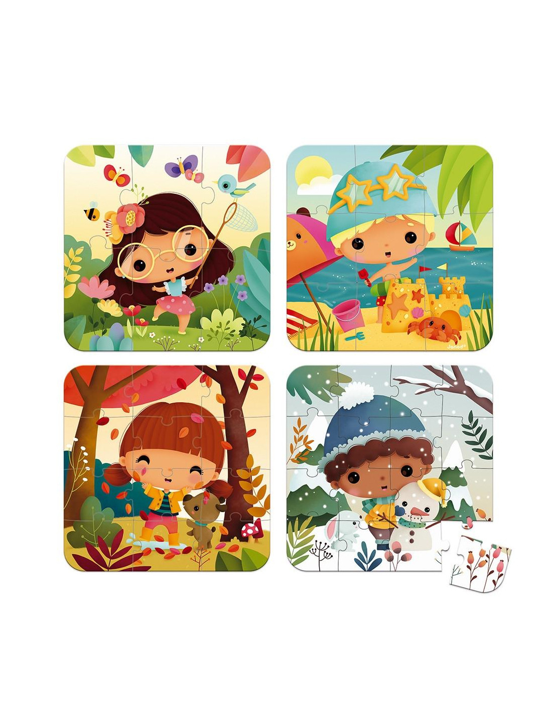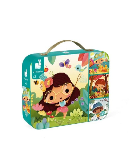 4 puzles evolutivos de cartón de 6, 9, 12 y 16 piezas con la temática de las 4 estaciones. Se venden en una bonita caja de regalo. Puzle: 20 x 20 cm.
