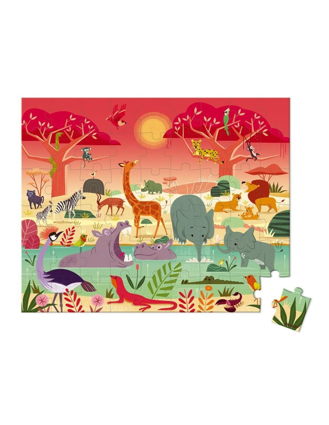 PUZLE - LA RESERVA DE ANIMALES- 54 PZAS Puzle de cartón de 54 piezas con la temática de la reserva animal. Póster incluido. Se vende en una bonita caja de regalo con asa de tela.