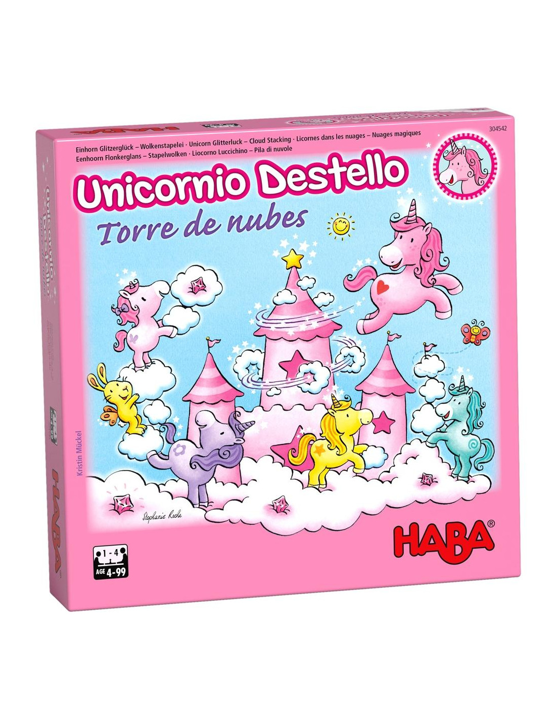 Contenido: 4 unicornios: Destello (rosa), Polvo Interestelar (amarillo), Flor de las Maravillas (lila) y Vorágine Mágica (turquesa), 1 unicornio pequeño, Rosalie (rosa), 1 castillo de nubes, 5 nubes blancas y 5 nubes de color azul de madera, 1 dado, 1 tablero en forma de nube, 16 fichas nube, 10 cristales de nubes, 1 instrucciones del juego.