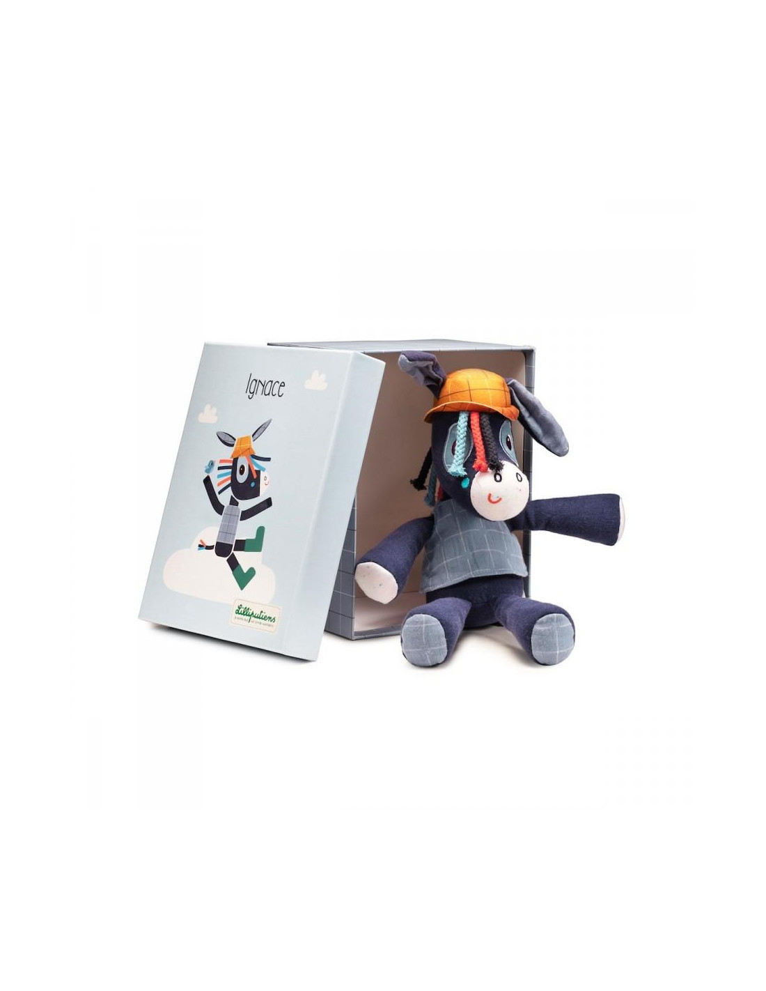 El burro Ignace siempre está contento. Le encanta salir de su preciosa caja de regalo con bonitos dibujos a darte un abrazo. Ignace está confeccionado en algodón orgánico.