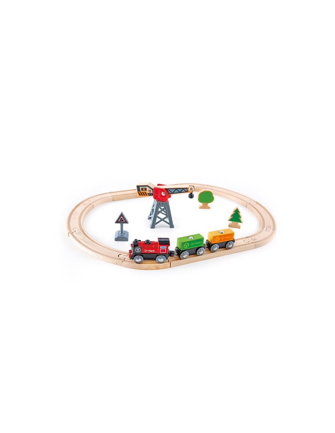¡Enciende la locomotora eléctrica y observa cómo avanza el tren por todo el circuito! Un primer circuito básico, con grúa magnética para cargar y descargar la mercancía del tren. A los pequeños les encantará ver como el tren se mueve por el circuito él solo. ¡Amplía el circuito con más accesorios Hape y personalízalo a tu gusto!A partir de 3 años