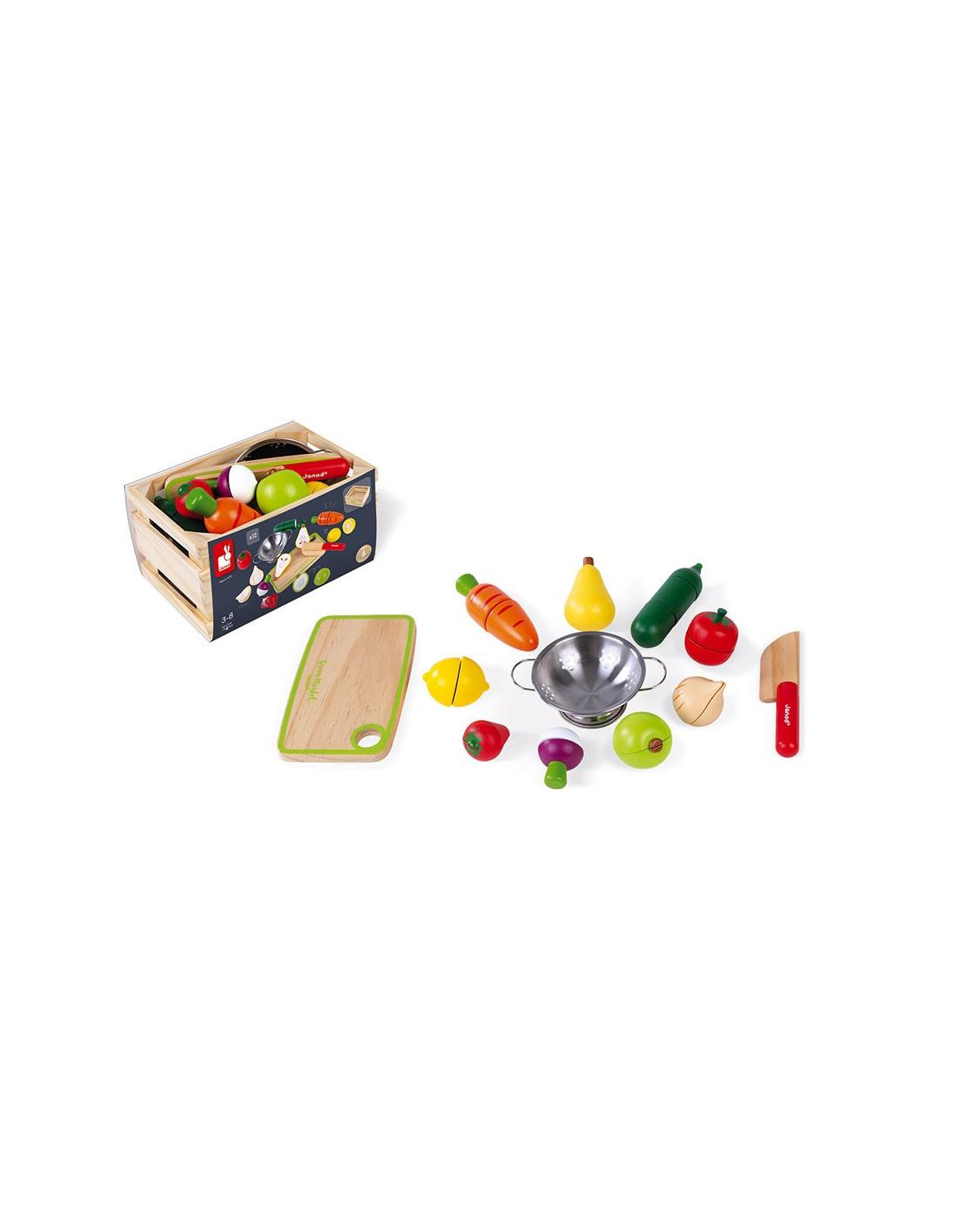 Esta caja de mercado se compone de 9 frutas y verduras para cortar (cebolla, calabacín, zanahoria, tomate, nabo, pera, limón, manzana y fresa) y una tabla, un cuchillo y un colador... Todo lo necesario para preparar los deliciosos platos imaginados por su hijo.