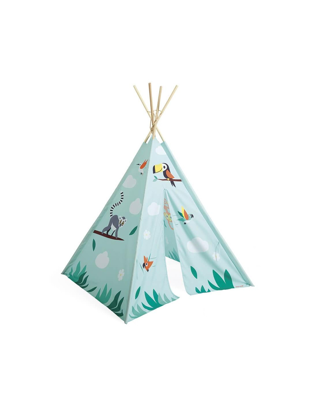 ! Para un momento de tranquilidad, momentos de juego o para jugar al escondite, ¡este adorable tipi de madera y tela encajará en la habitación de tu hijo, en su sala de juegos o en la sala de estar! Ideal para imaginarse mil historias en su propio escondite, este tipi infantil es apto para niños de a partir de 2 años. ¡Podrán instalarse cómodamente y dejar que su imaginación vuele, aislarse y jugar solos, o invitar a familiares y amigos! Se abre la entrada (95 cm de altura) y se atan las dos alas en sendos lados con la ayuda de las cintas. Este tipi consta de 4 varillas de madera con certificado FSC®, cada una dividida en 3 piezas: para facilitar el montaje/desmontaje, las 3 piezas están conectadas por tubos de plástico. Montaje por parte de un adulto. ¡La tela del tipi está bonitamente decorada con un estilo exótico y se puede lavar a máquina! Además, puedes llevarte el tipi a todas partes gracias a su práctica funda de almacenamiento con asa, lavable a máquina. Esta bonita cabaña aportará un toque colorido a tu decoración y será un cómodo refugio para tu hijo.