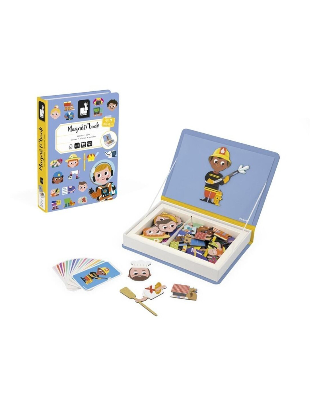 Cuando sea mayor, seré... ¡Abre tu Magnéti’book para descubrir las profesiones! Con este bonito y colorido juguete magnético, su hijo descubrirá 16 profesiones, ¡y tendrá la posibilidad de inventar muchas más! Está compuesto por un soporte magnético, 48 imanes y 16 tarjetas que representan profesiones conocidas. Tanto los más pequeños como los mayores se divertirán reproduciendo los modelos y mezclándolos para imaginar combinaciones de profesiones, cada una más alocada que la otra. Juguete magnético de cartón FSCTM para niños de 3 a 8 años. .