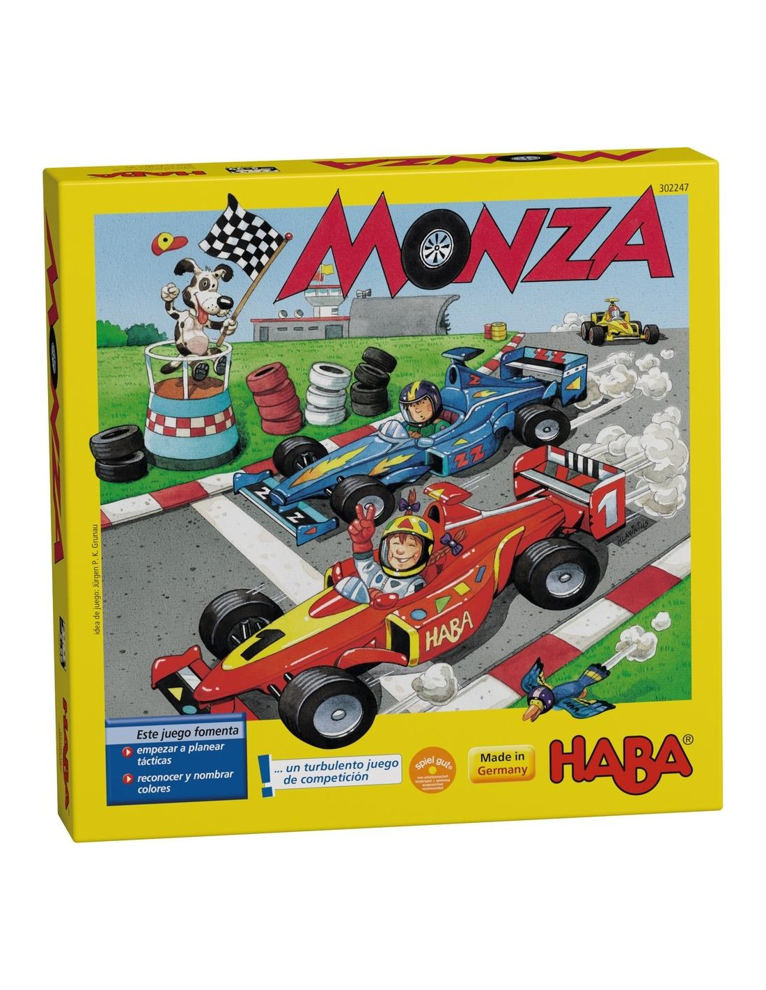 MONZA Primer juego de táctica sencilla y planificación con dados de colores. En cada turno debemos tirar los seis dados y combinar sus colores para avanzar y/o cambiar de carril según el orden en el que los coloquemos. Es importante pensar en la mejor opción en cada turno, para así lograr llegar a meta los primeros/as. Los coches se preparan para correr la carrera. Sólo podrás avanzar si consigues con el dado el mismo color que tu coche. En cada jugada se puede llegar a avanzar seis casillas si sabes combinar y tienes suerte con el dado.