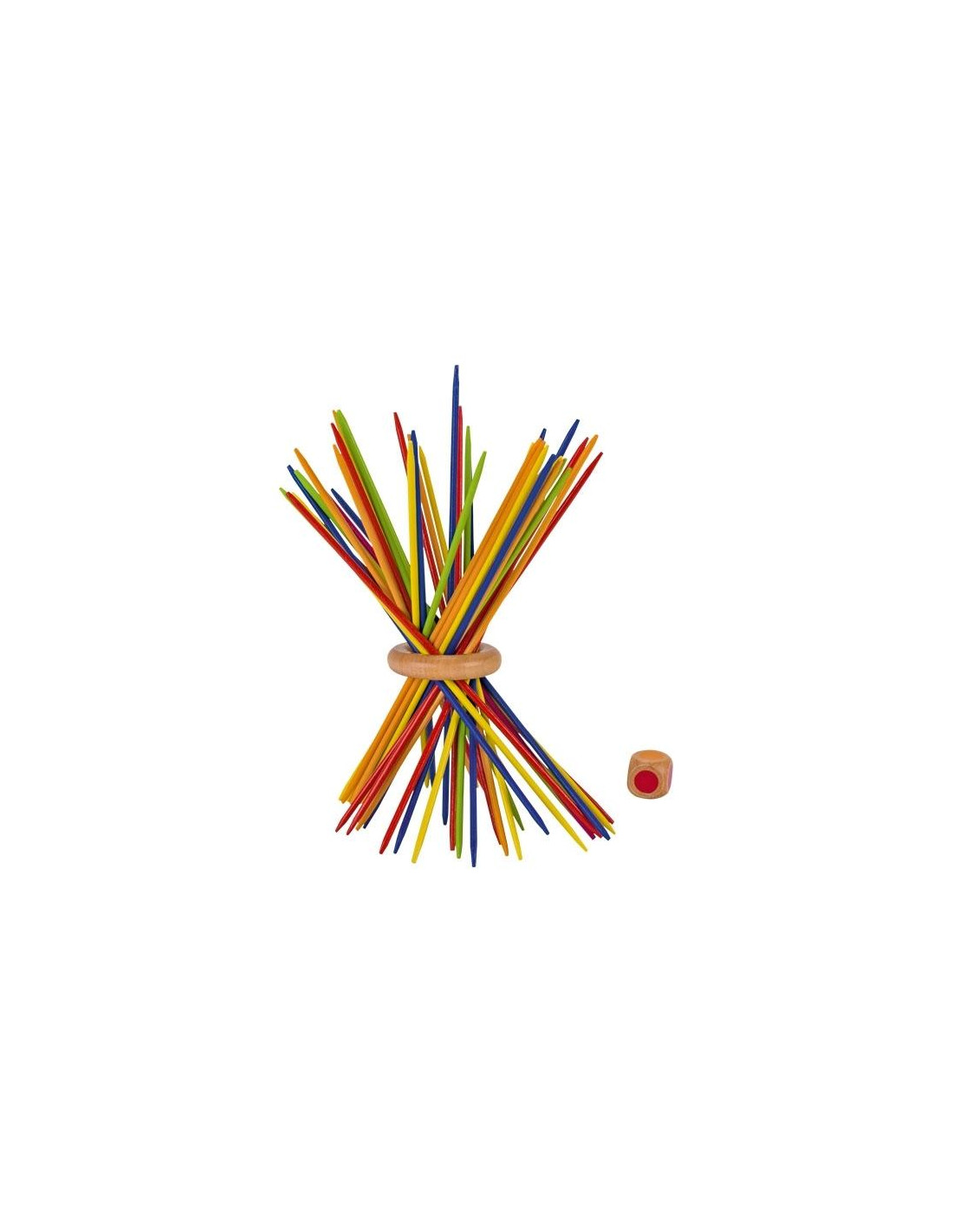 Un mikado diferente. El dado indica el color del palito a extraer. Ahora no extraer el palito erróneo, sino se cae el anillo. Un juego nada largo y para nada aburrido.