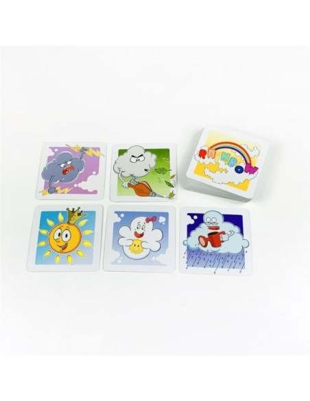 "Rainbow es un divertido juego de cartas para toda la familia donde los jugadores tendrán que formar su arcoíris. Pero no será tan fácil, las tormentas, las nubes y el viento te lo impedirán, pero te podrás ayudar del sol y la lluvia para conseguirlo.