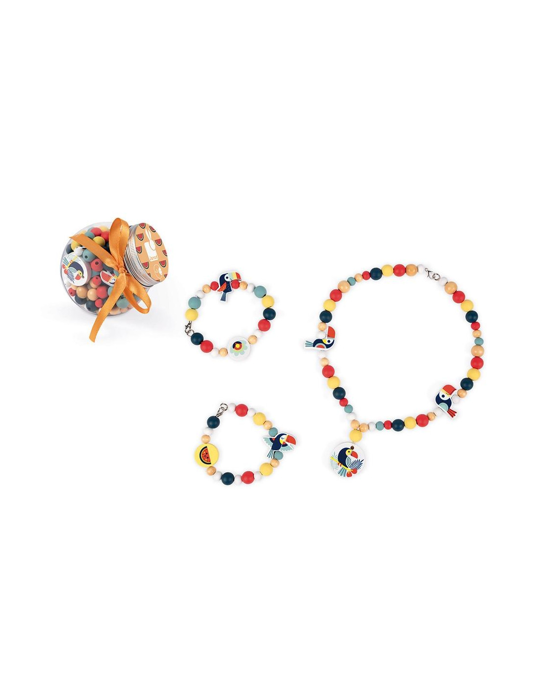 Bonita bombonera con su pequeño lazo de tela y con 220 cuentas en su interior, de las cuales 12 son colgantes con la temática de los pájaros y las frutas Contiene : 5 cierres, 3 metros de hilo elástico de nailon.