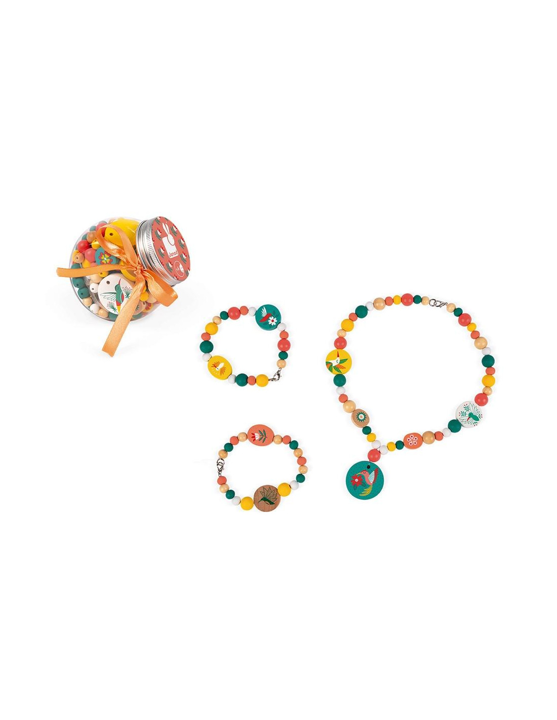 Bonita bombonera con su pequeño lazo de tela y con 220 cuentas en su interior, de las cuales 18 son colgantes con la temática de los pájaros. Contiene : 5 cierres, 3 metros de hilo elástico de nailon