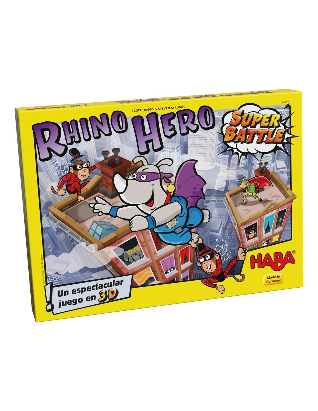 Rhino Hero y sus amigos superhéroes viven infinidad de aventuras en el rascacielos de cartas. Pero, cuidado, porque el rascacielos es cada vez más alto e inestable a medida que se le van añadiendo cartas. El que tire el dado con habilidad, mueve a sus superhéroes hacia arriba y defiende su lugar en las batallas contra otros jugadores... si no fuese por los monos-araña, que hacen tambalear el rascacielos.