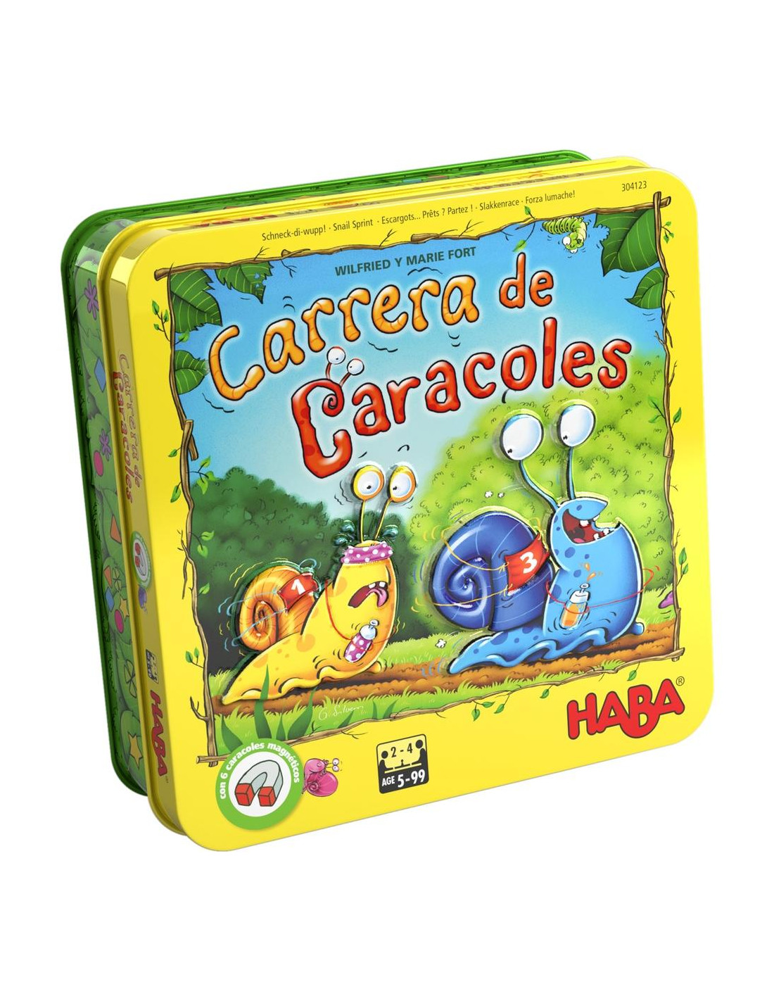 Contenido: 6 caracoles, 2 dados, 12 cartas de juego, 1 tablero, 1 podio, 1 parte inferior de la lata, 6 láminas magnéticas, 1 instrucciones de juego.