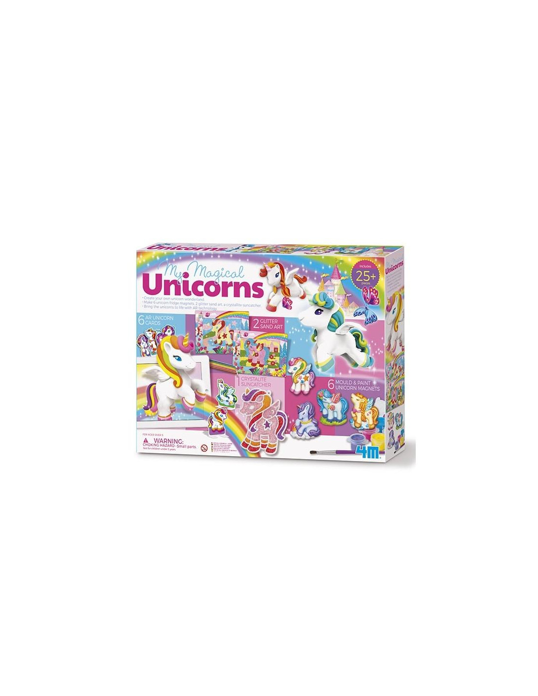 El kit incluye: 1 molde con 6 diseños, 1 bolsa de yeso, 1 banda de caucho magnética, 1 set de pintura, 1 pincel, 2 cartulinas adhesivas pre-cortadas, 2 marcos de fotos, 6 pajitas de arena con brillantina, 1 placa transparente, 4 sobres de cuentas de cristal de colores, 1 tubo de pegamento, 1 cordel, 1 plantilla de 6 cartas de unicornios e instrucciones.