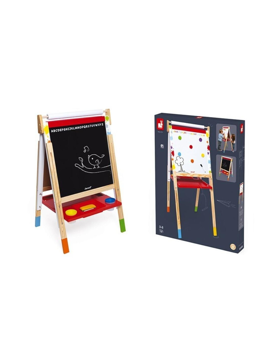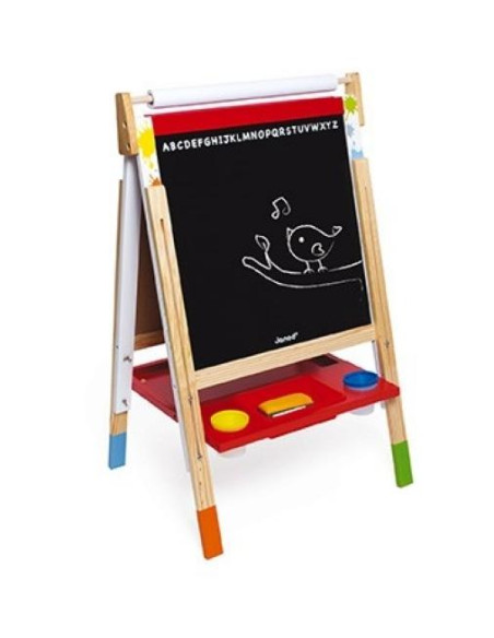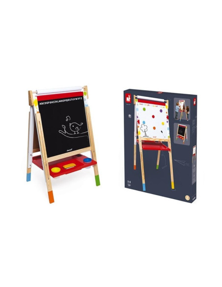 Juguete de madera, para niños de 3 a 8 años. Una pizarra blanca para escribir con rotulador, y una pizarra negra para escribir con tiza. Incluye numerosos accesorios: 6 peças magnéticas, 10 tizas, 1 rotulador para pizarra blanca, 1 rollo de papel y 1 borrador para pizarra. Altura regulable de 91 a 126 cm. Extremadamente práctica: la pizarra se pliega para poder guardarla con mayor facilidad.