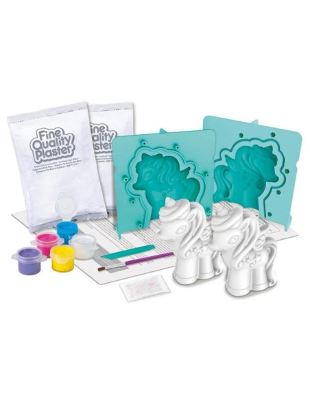 Los unicornios son criaturas fantásticas que siempre han captivado a los más pequeños. Y, ¿qué mejor que poder los suyos propios? Con este kit para moldear y pintar, podrán formar los unicornios a base de yeso y posteriormente pintarlos con sus colores favoritos. ¡Que viva la creatividad! - Incluye: 2 moldes de unicornio, escayola, tira de pinturas, pincel e instrucciones detalladas. Pinta y moldea Unicornios en 3D