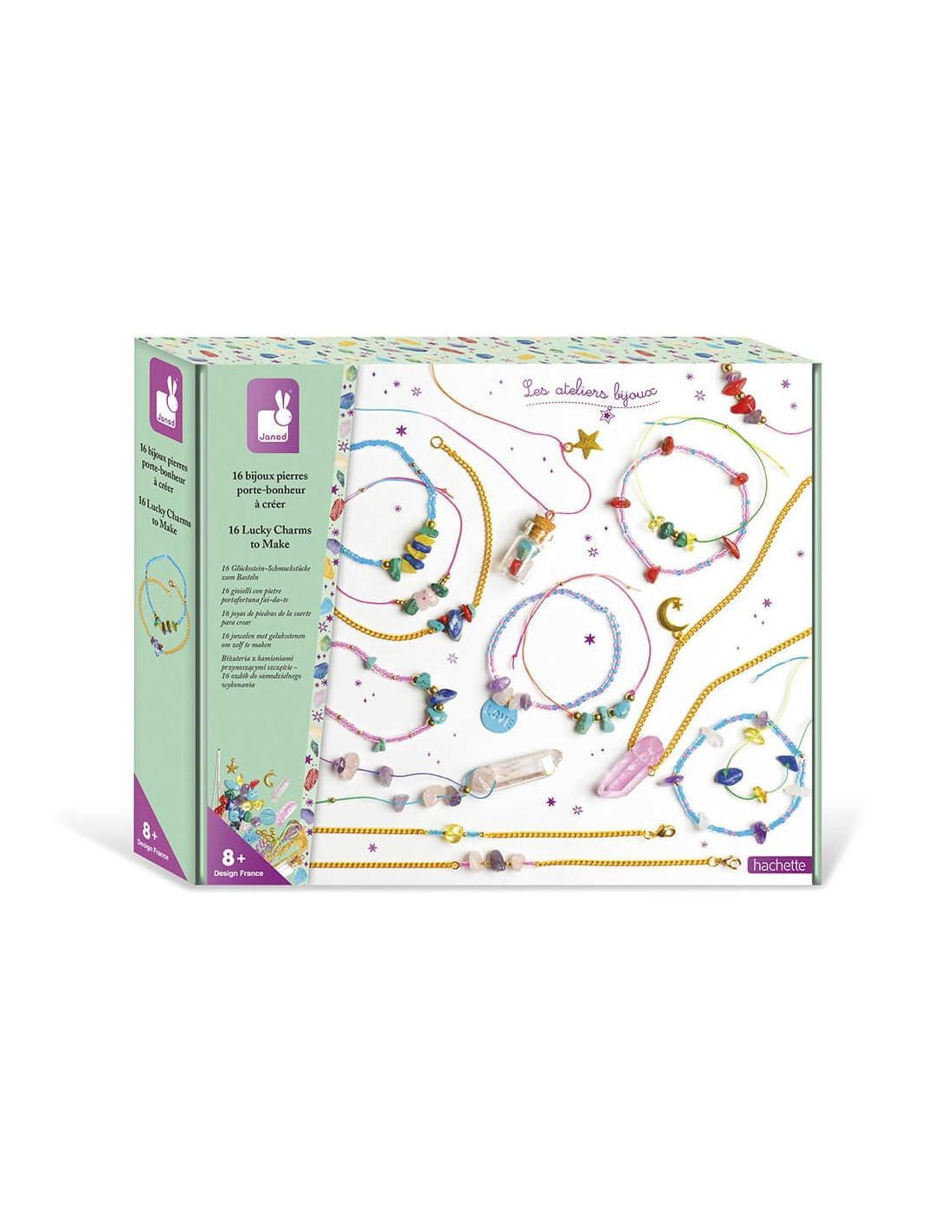 16 JOYAS DE PIEDRAS DE LA SUERTE PARA CREAR ¡Crea tus joyas con piedras de verdad, eligiéndolas por su color o por su significado! Este kit creativo permite realizar 16 pulseras y collares hechos con piedras de verdad. Los niños pueden seguir los pasos detallados en el folleto paso a paso para hacer cada modelo de joya. ¡Pero podrán elegir las piedras que prefieran, que se adapten a su estado de ánimo o que les traigan suerte! ¡Cada piedra corresponde a una situación! ¿Falta de ánimo? ¡Elegimos lapislázuli! ¡Por supuesto, es posible combinarlas para obtener joyas multiefecto! Otros accesorios completan este estuche para tener todavía más estilo: cuentas, frascos, hilos de colores... Esta actividad creativa ayuda a desarrollar la motricidad fina y la creatividad, y requiere unas 8 horas para hacer las 16 joyas. Ideal para niños de a partir de 8 años.