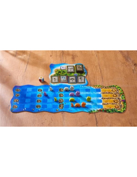 CONTENIDO: 4 dragones de agua (de tres piezas cada uno), 1 océano (tablero de tres piezas para montar), 1 isla (depósito para cartas), 36 cartas, 1 dado, 1 instrucciones del juego