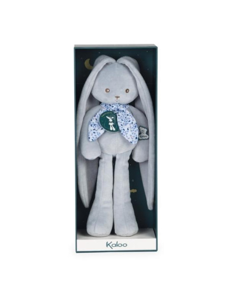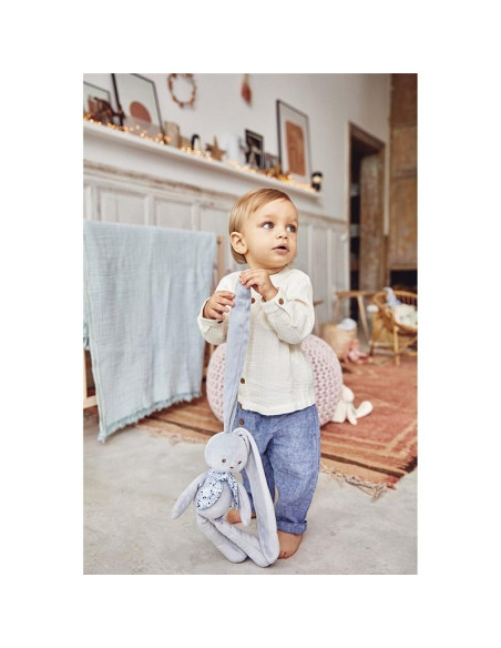 LAPINOO - CONEJITO MUÑECA AZUL - MEDIANO Este alegre conejito azul tiene las orejas tan largas que se puede enganchar en cualquier lugar para guardarlo y no perderlo nunca. Se puede hacer de todo con él: el pino, el columpio, se puede colgar en la cuerda de la ropa e, incluso, balancearse a la luz de la luna. Con sus largas orejas, envuelve a los bebés con suaves abrazos y comparte con ellos momentos de ternura. Lavable a máquina. Presentado en una bonita caja de regalo personalizable con un mensaje en el espacio disponible bajo la tapa.