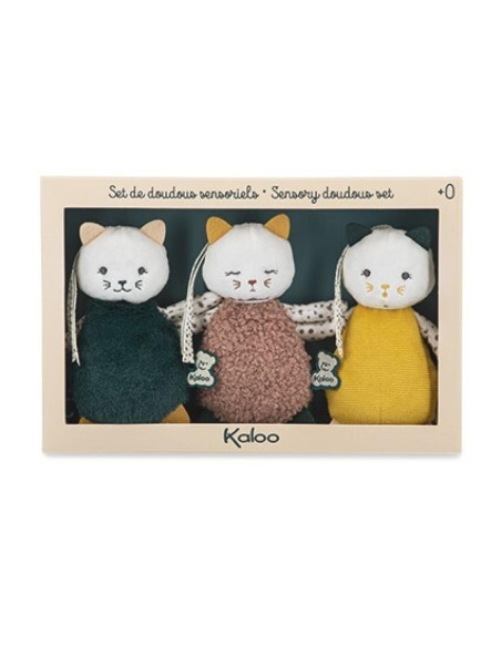 Desarrollado en colaboración con psicomotricistas, este juego de tres gatitos de peluche es ideal para desarrollar el tacto del bebé. Pesado, ligero, rizado, tupido o con sonido, cada gatito tiene sus propias peculiaridades que el bebé disfrutará sintiendo y descubriendo para un enriquecedor y variado juego sensorial. Desde el nacimiento. Puntos fuertes : - Desarrolla el agarre preciso - Telas con diferentes texturas para que el bebé se familiarice con diversas sensaciones táctiles - Colores y estampado de lunares con contraste para desarrollar la vista del bebé - Cintas para colgarlo en cualquier lugar Consejo: Deje que el bebé descubra por sí mismo los diferentes tactos colocando los gatitos cerca de él. De esta forma, desarrollará sus habilidades sensoriomotrices. Descubra otros productos de la gama Stimuli de Kaloo para acompañar a su hijo durante todo su desarrollo a través de los llamados juegos sensoriomotrices .
