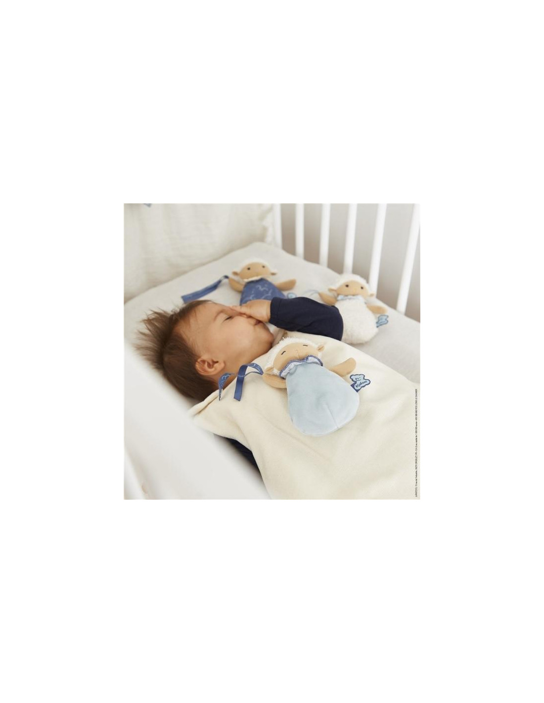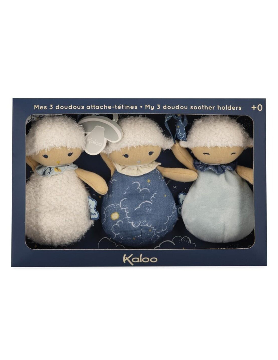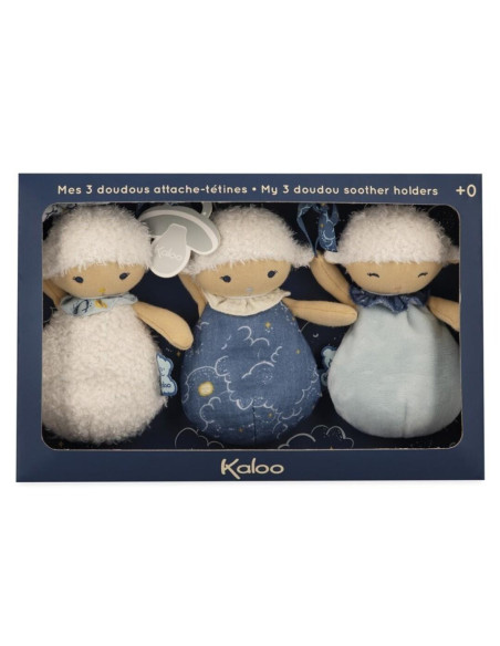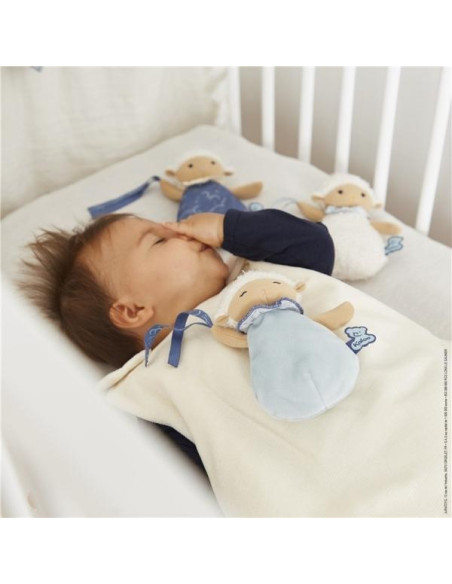 Descubra la gama Doux Sommeil (Dulces sueños), creada sobre la temática del sueño del bebé que se encuentra en el centro de las preocupaciones de los padres. Los productos diseñados están dedicados al momento de acostarse, con el fin de calmar al bebé desde los primeros instantes y ayudar en la implantación de un ritual de acostarse a medida que crece. Para esta gama, la etiqueta del oso Kaloo es fosforescente para que brille suavemente por la noche. Tres dudús de corderitos cuelgachupetes (15 cm), cada uno con sus particularidades y su color para que el bebé pueda servirse de él como dudú, pero también para colgar el chupete con la ayuda de la delicada cinta. Gracias a este set, podrá usarlo como ayuda inmediata o dejarlo en diferentes lugares para que el bebé se sienta tranquilizado a donde vaya y pueda dormirse plácidamente. Desde el nacimiento. Lavable a máquina.