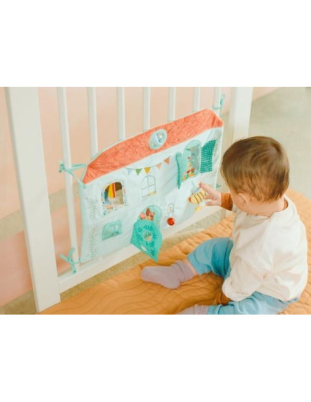 ¡Hay actividad en la casa de Stella y Joe! Suena la campana... la puerta y las cortinas se abren, la abeja zumba alrededor de la flor... Este panel lleno de descubrimientos y actividades estimulantes se adhiere fácilmente a la cuna del bebé.
