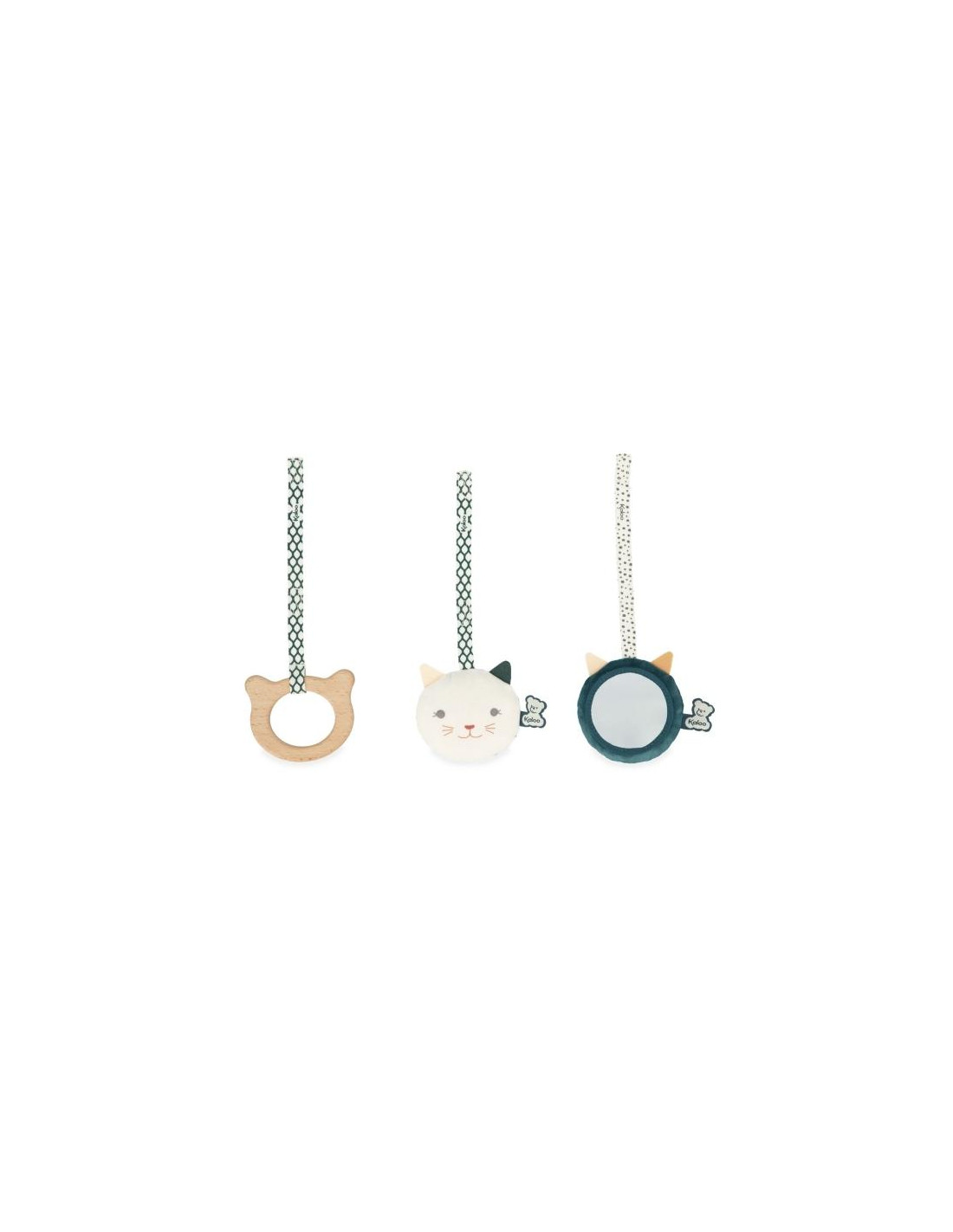 Desarrollado en colaboración con psicomotricistas, este juego de accesorios sensoriales portátiles es ideal para llevar y colgar en cualquier lugar para estimular al bebé desde el nacimiento. Estas 3 formas de gatos con diferentes colores y texturas (madera de haya, muy suave con un cascabel, espejo) permiten desarrollar la vista, el oído, el tacto y el agarre. Los accesorios se enganchan con las cintas y se pueden poner en un arco, una alfombra de actividades, un cochecito o incluso una silla de bebé. Lavables a máquina a 30 °C.