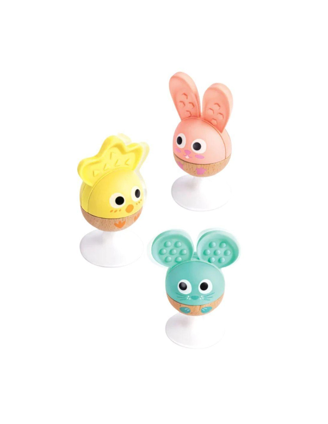 Un delicioso trío de ratón, conejo y cascabeles de chick. Estos encantadores compañeros animales involucran a los bebés con orejas de silicona que también pueden masajear chicles. Además, los sonidos de cascabel suaves inspiran curiosidad y exploración sensorial. Añade una capa extra de diversión a tus comidas pequeñas usando las ventosas para pegar a estos amigos peludos en la mesa o en la bandeja. Mira si tu pequeño puede repetir el orden en que sacudes cada cascabel para crear un sonido.