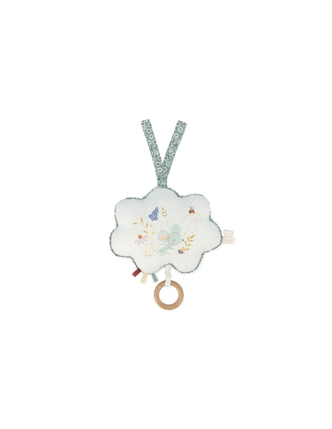 CAJA DE MÚSICA DE TELA EL RATÓN VERDE La caja de música de tela delicadamente estampada y bordada con la temática El ratón verde es un elemento clave para el desarrollo del bebé. Tirando de la anilla de madera del final de la cuerda, escuchará la canción infantil El ratón verde para que pueda cantársela al bebé. Su pequeño tamaño de 15 cm y su cinta permite llevarla y engancharla en cualquier lugar. La caja de música es resistente al agua, por lo que puedes lavar fácilmente el cojín a mano sin riesgo.