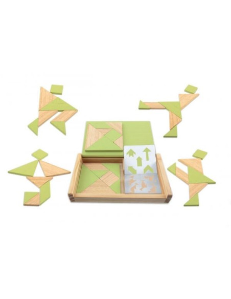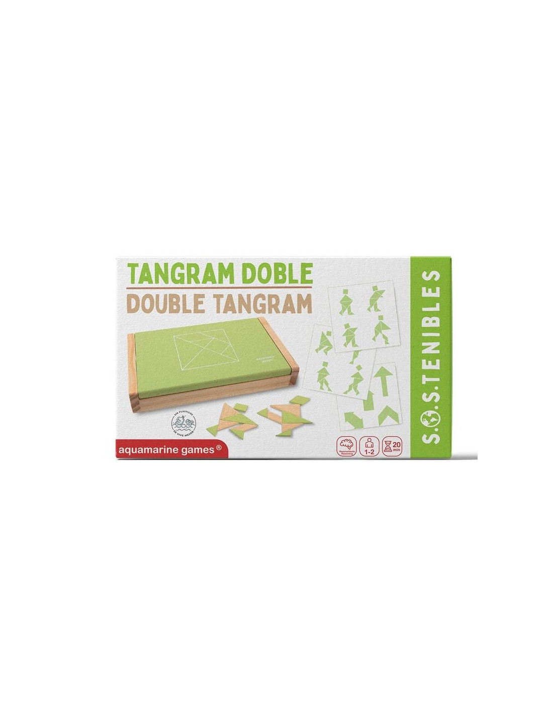 El Tangram Doble en caja S.O.S.TENIBLES de Aquamarine Games está fabricado integramente en madera FSC100% proveniente de bosques gestionados de manera responsable y ausencia total de plásticos. Incluye 2 Tangram en colores Verde y Pino, plantillas con multitud de figuras y las soluciones. De 1 a 2 Jug.