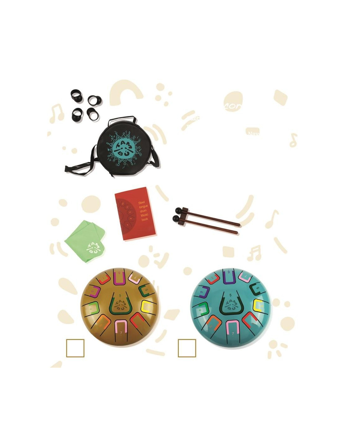 Incluye las baquetas, una atractiva bolsa de transporte para que puedas llevarlo donde quieras, un soporte para las baquetas y 4 adaptadores para tocar con las manos. También un librito explicativo en inglés con canciones Tambú 8" 11notas - Col. Oro
