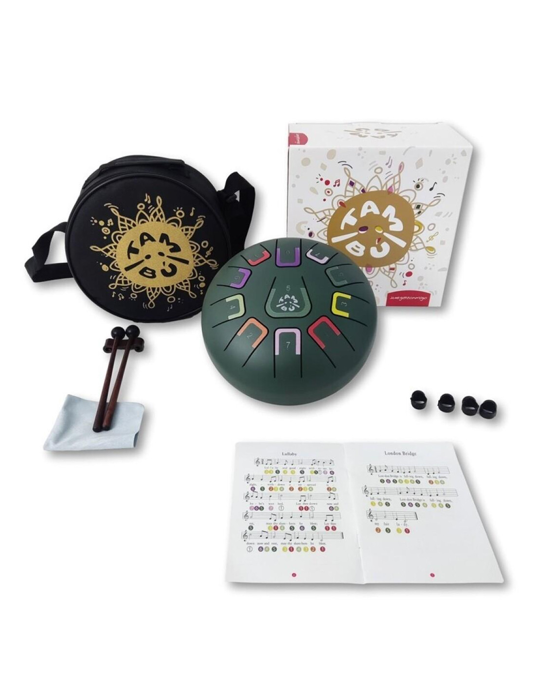 El TAMBÚ puede hacerse sonar de diferentes maneras. Viene acompañados de partituras en números y colores para aquellos que empiezan.